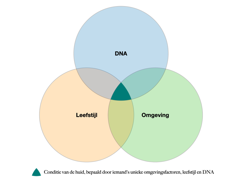 Onder DNA vallen zaken die je van nature meegekregen hebt: aanleg voor rimpelvorming, huidgevoeligheid, de hoeveelheid en kwaliteit van collageen die je aanmaakt, hoe goed je huid zichzelf beschermt tegen UV-straling, je talgproductie, hormoonhuishouding en nog veel meer.